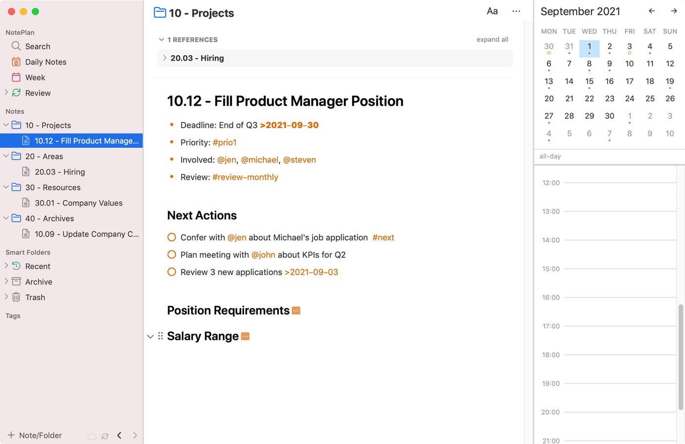 Agenda gives users a set of predefined structures: Categories, Sub-categories (a premium feature), Projects, and Notes. NotePlan gives users the freedom of folders and notes, which offer unlimited ways of organization. It allows you to implement systems like Getting Things Done (G.T.D.), P.A.R.A., Johnny Decimal, or any method you feel at home with.