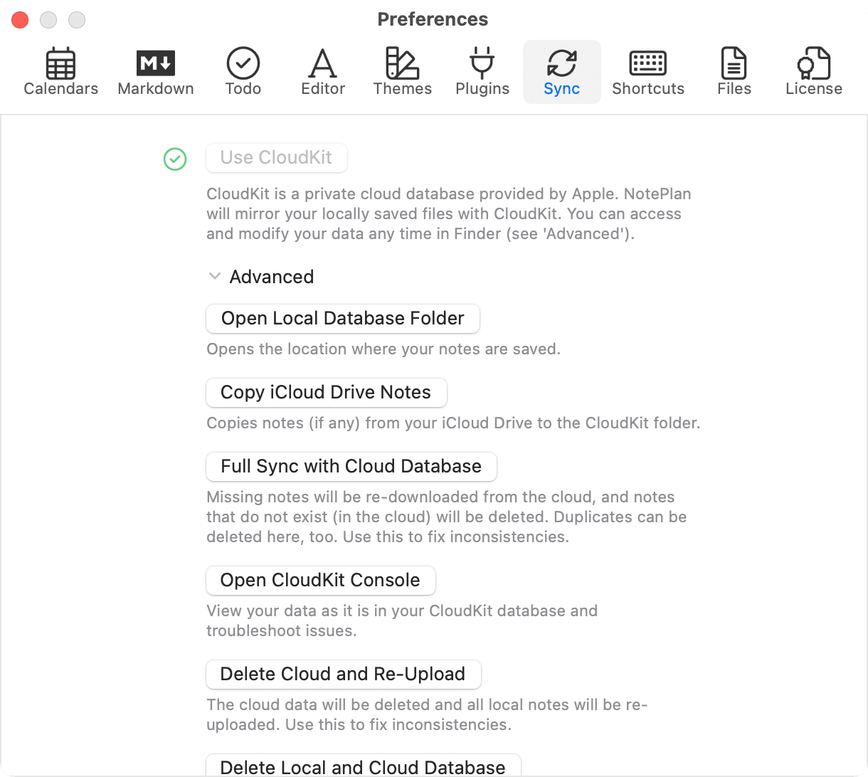 NotePlan lets you sync notes with CloudKit alongside iCloud Drive, an option that’s not available in Agenda. CloudKit is Apple’s database and authentication framework for cloud files and is faster and more reliable for frequent changes. What’s more, it’s not dependent on iCloud’s intermittent background sync. If you want to, NotePlan offers additional advanced sync options to work with.