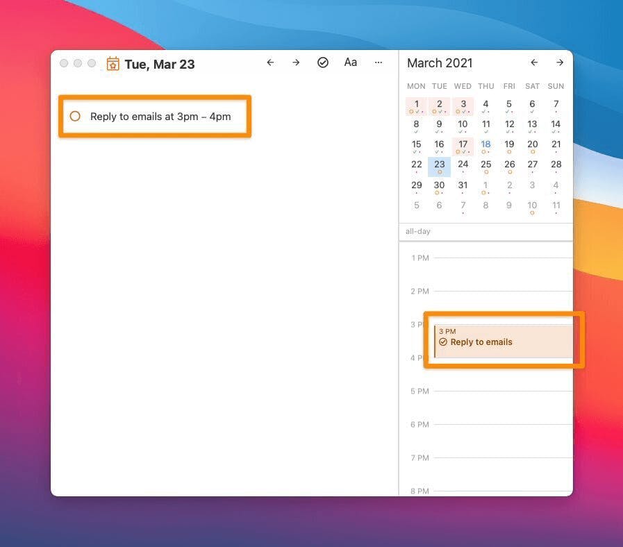 Tasks are also tightly integrated with the calendar. Inside a daily note, you can easily add a timecode like at 3-4 pm to time-block a task on the calendar. It allows you to visually plan your day and get a feel for your workload.