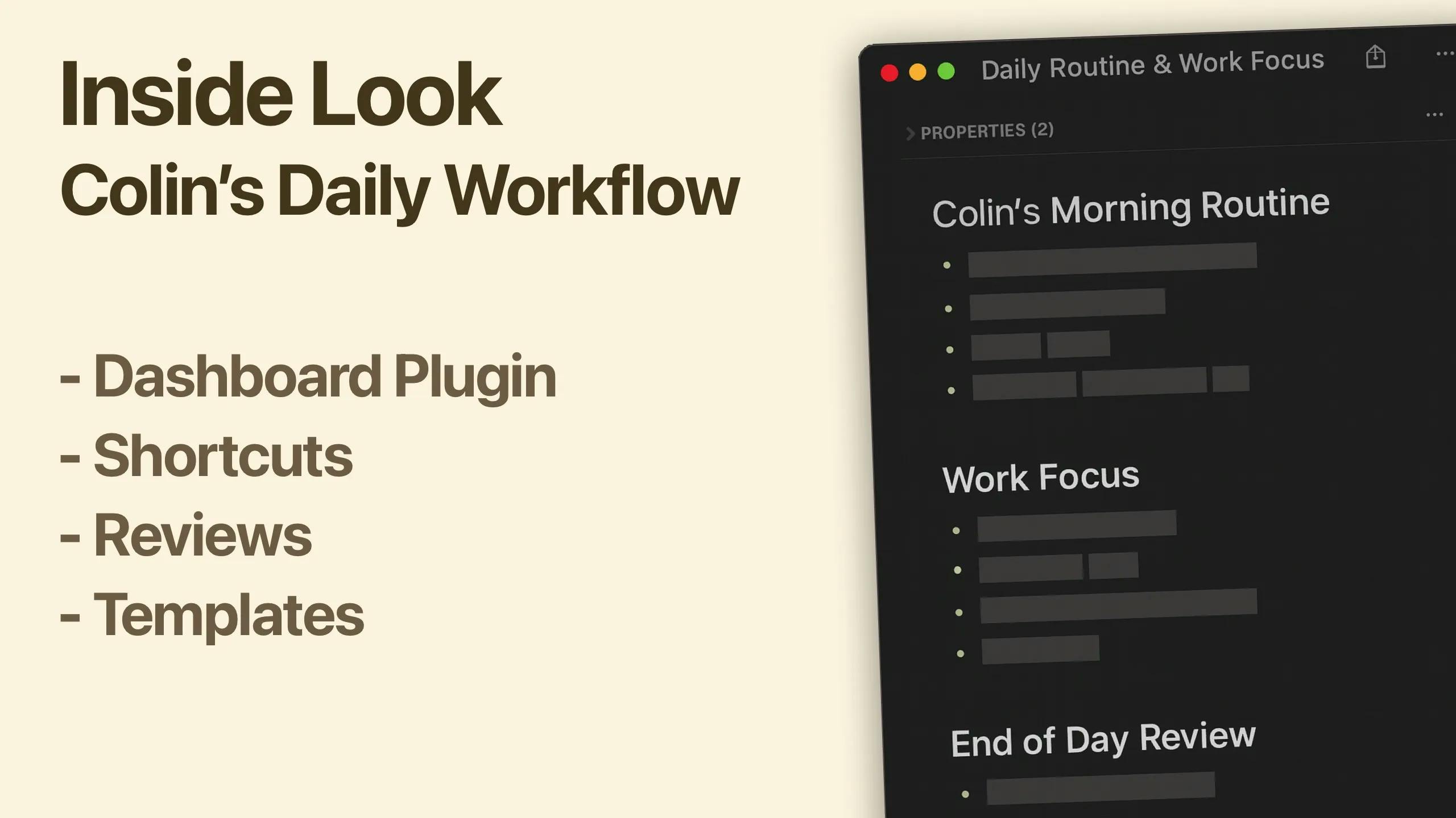 DAILY REVIEW: Throughout the day, Colin captures tasks via shortcuts on my Mac and iPhone. He uses different templates for weekdays and weekends, and builds his activities around the “Big Three” priorities on his dashboard and daily note. He uses the Eisenhower matrix to define these priorities. He reviews his dashboard throughout the day, logs work, and date-stamps notes and conversations, moving tasks out of his daily notes to future dates, projects, or to weekly/monthly notes as needed.