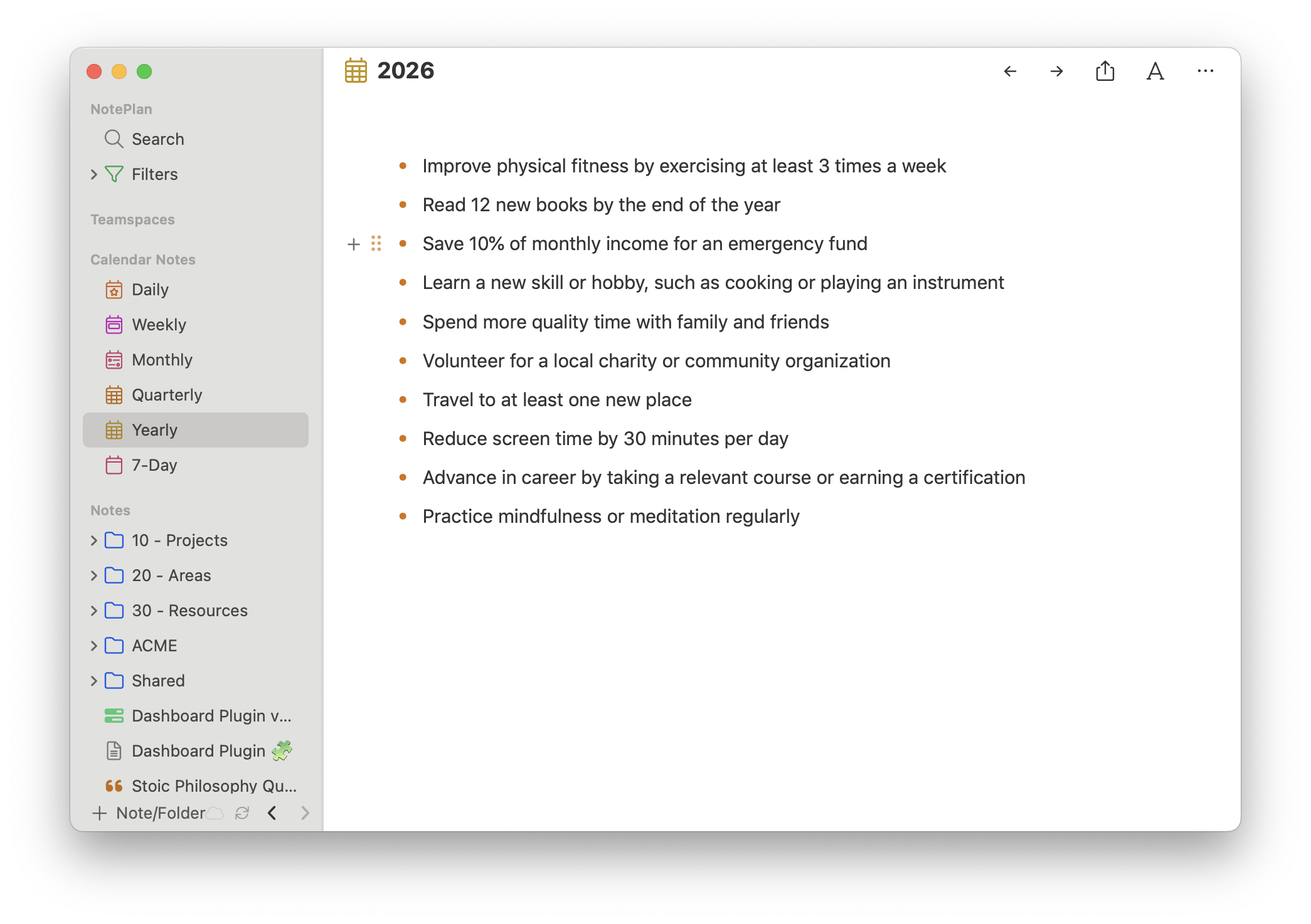 Plan goals in NotePlan using either regular notes, or even better: periodic notes. Such as the yearly note, which is perfect to set goals for the year.
