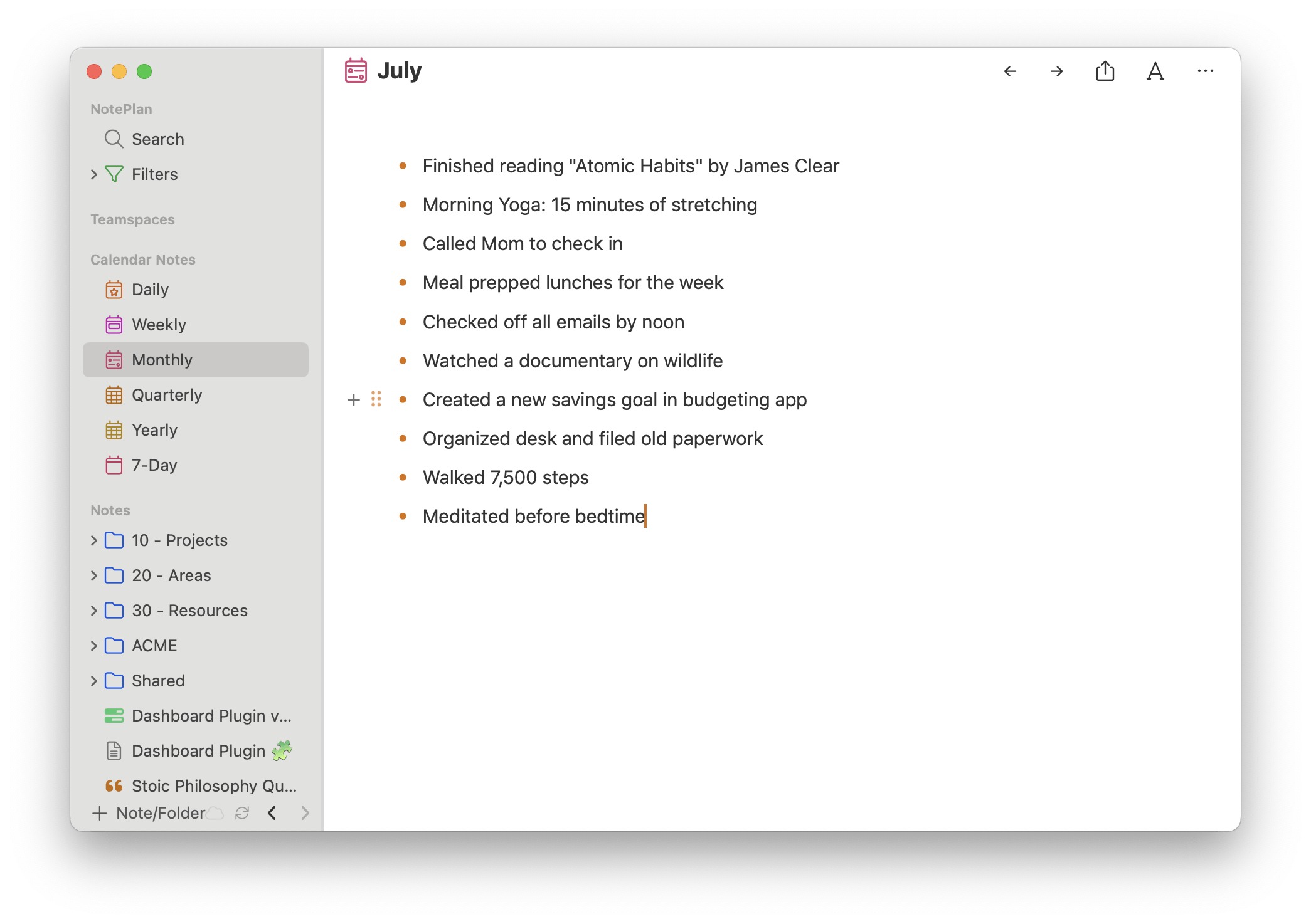 With NotePlan, you can manage your monthly calendar either using a monthly note or simply jumping to the day in the month in the monthly date picker top right.