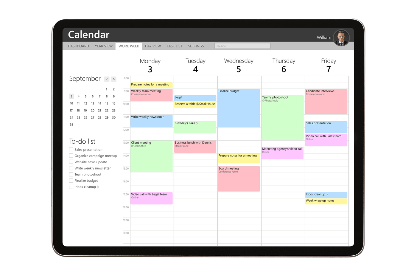 - The example uses day theming, too. Tuesdays have meetings and calls, Thursdays have planning;