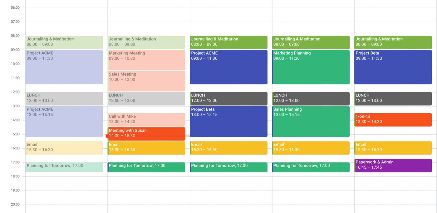 Sometimes people ask why I bother with such a detailed level of planning. My answer is simple: it generates a massive amount of productivity. A 40-hour time-blocked work week, I estimate, produces the same amount of output as a 60+ hour work week pursued without structure.