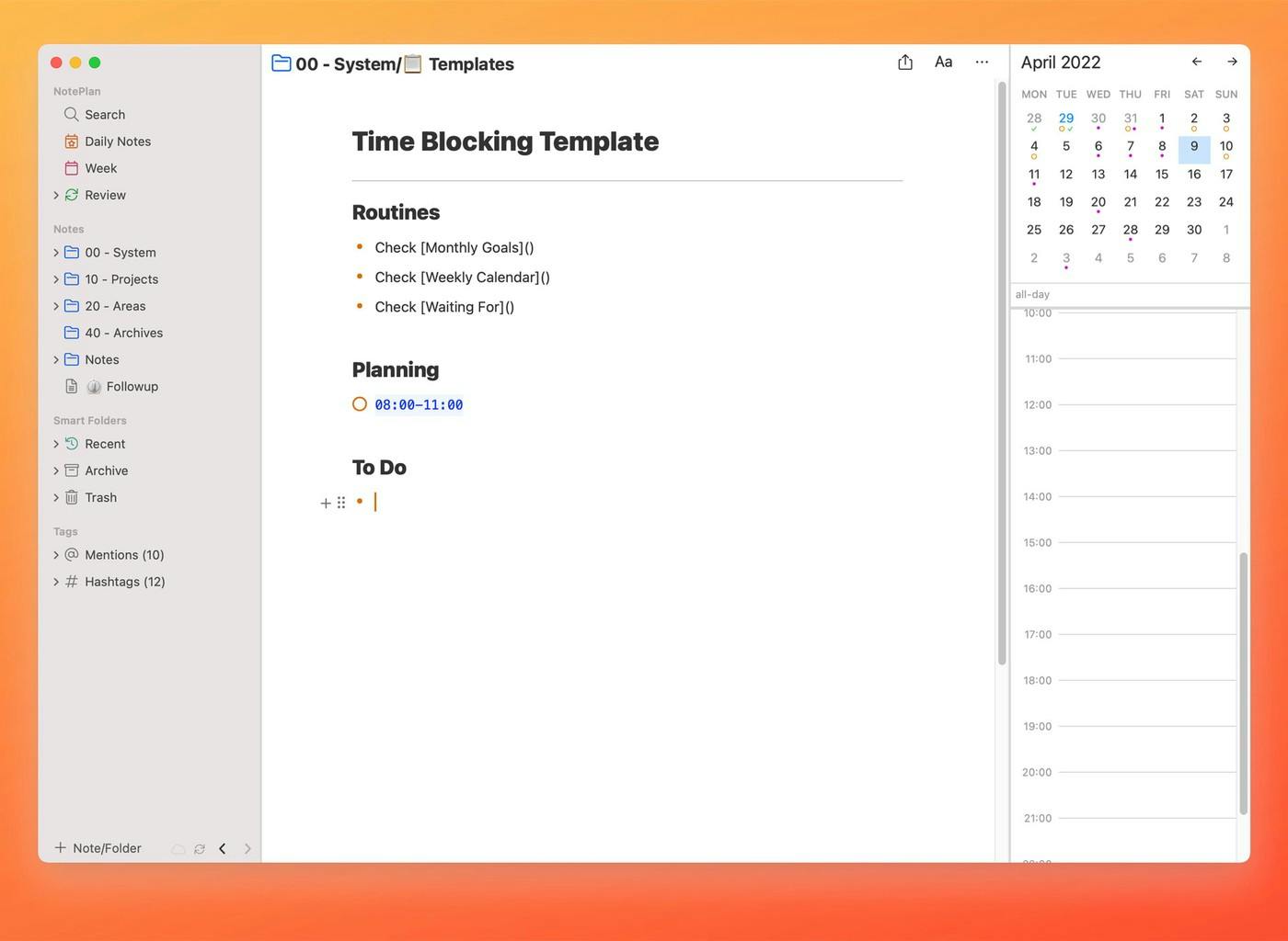 To make sure your next time blocking experiment is a success, we’ve created a NotePlan Template. Add it to NotePlan by opening the link, then copy the contents into a new note. You can use the “Templates” plugin (see Preferences -> Plugins) to insert it with a command or simply copy/paste it into a new daily note every day (version v3.5 will have more templating features and this template will be automatically included).