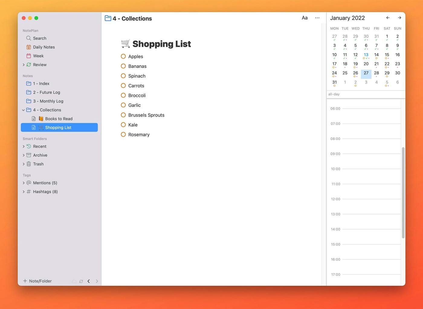 In NotePlan’s sidebar, the Notes area lets you create an Index, a Future Log, and any Collections you want to. You can organize everything with Folders, Notes, or Tags and create as many levels as you like.
