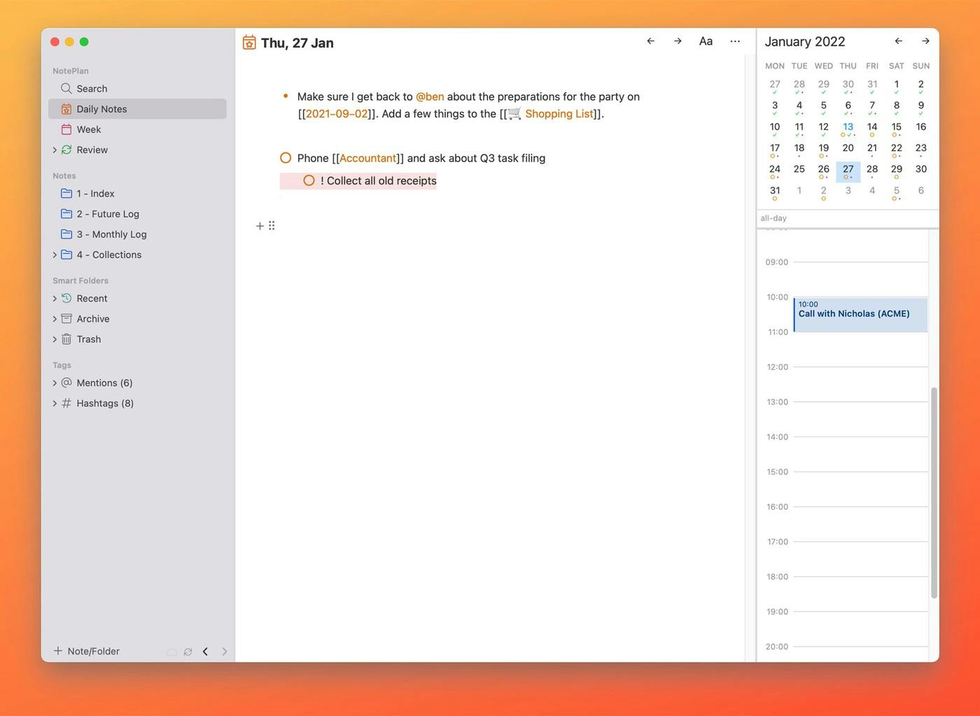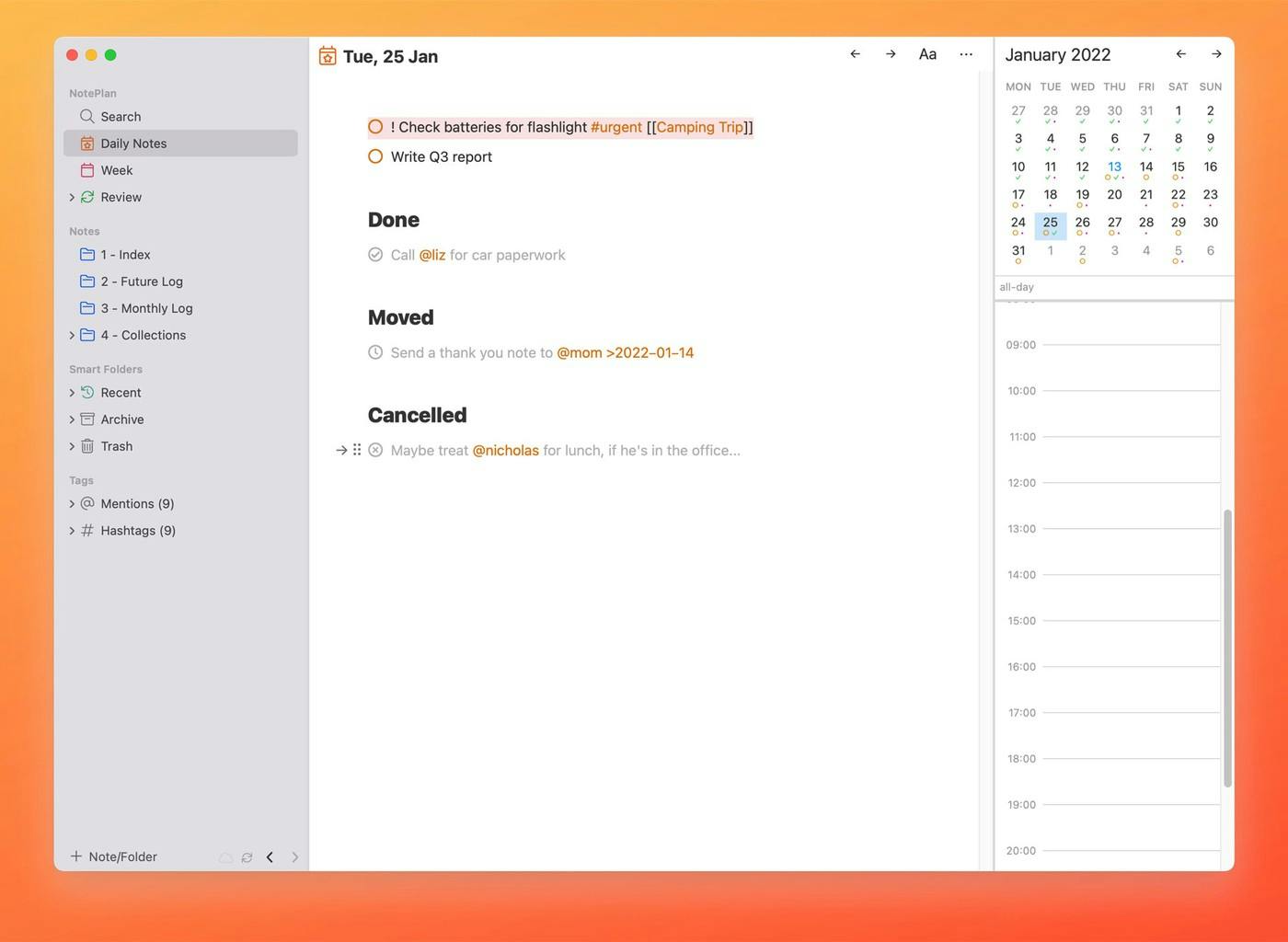 NotePlan takes the ideas behind bullet journalling and translates them seamlessly from the physical page to your digital devices. It offers the same BuJo freedom and flexibility but makes your workflow much more efficient and practical. If you’ve already used the physical system, you’ll feel immediately at home using NotePlan.