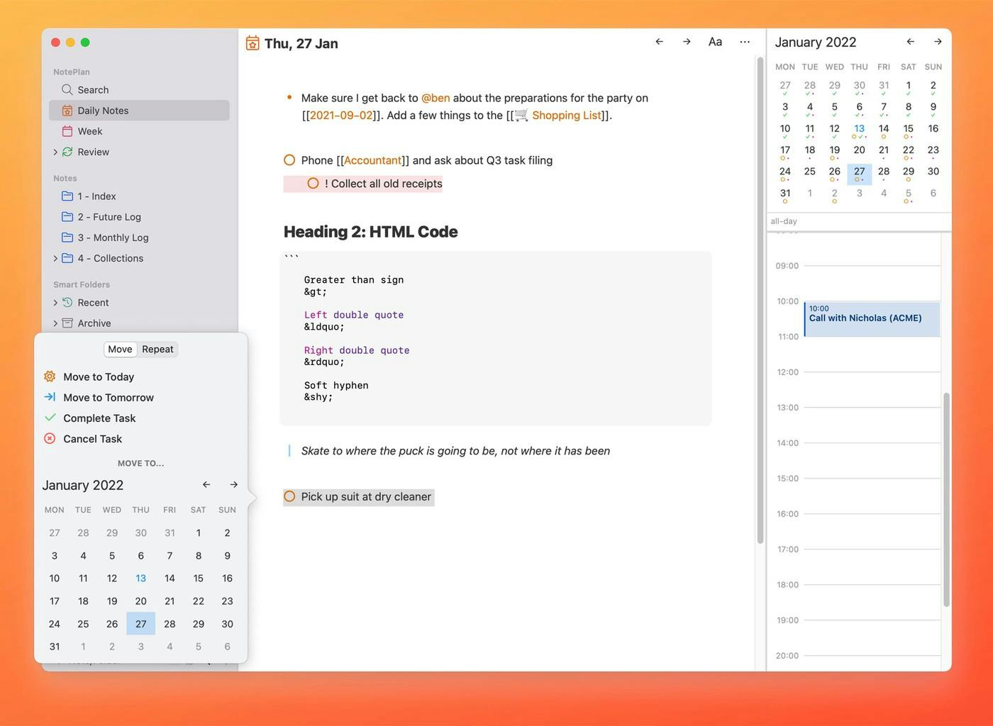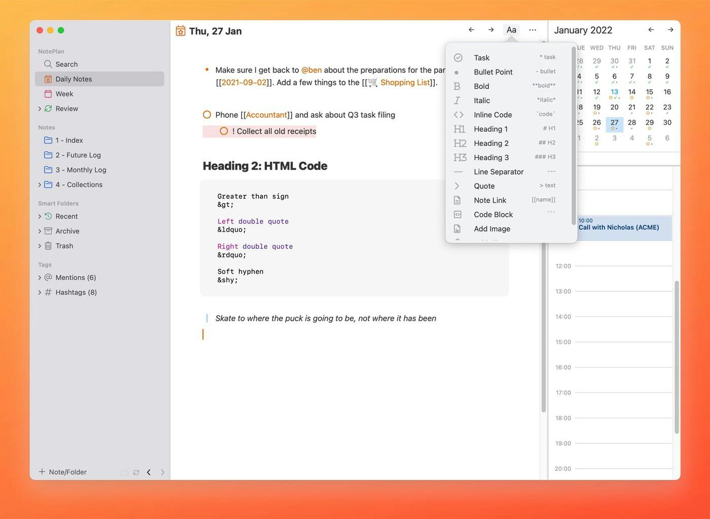 The Bullet Journal’s rapid logging shorthand is available in NotePlan, too, and it will feel very familiar if you’ve used a physical journal. NotePlan uses Markdown, an easy syntax that automatically converts symbols to specific “entries”: