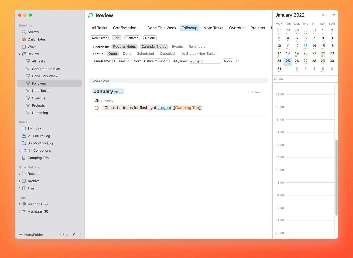 With Review, you can even create and save custom searches. Let’s say you want to see all tasks tagged with #urgent. Or everything you completed last week. You can even save a search for a keyword inside just your notes. Maybe you have a key concept like “postmodernism”, and you want to get an overview of where it’s used inside all of your notes. In NotePlan, you can easily create a Review filter to do just that.