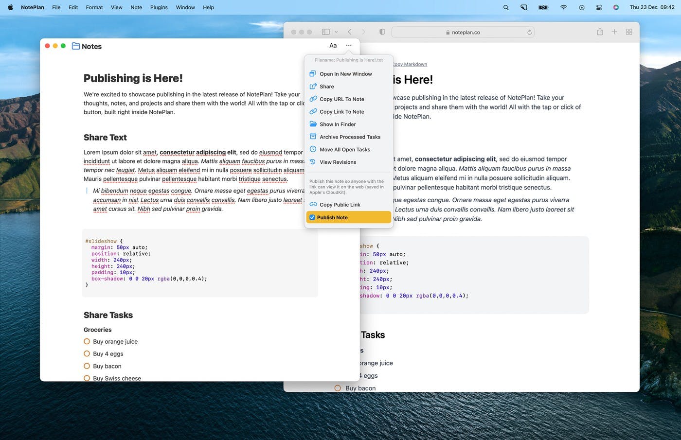 A journal is usually private—they’re your personal notes, after all—but there may be situations where you want to quickly share something with your colleague, friend, partner, or even the world. A small snippet of code, a shopping list, or some meeting notes. NotePlan lets you publish a note online with a single click or tap. Just select Publish Note and copy the public link, then send it to anyone you like. The note will even update as you make changes.