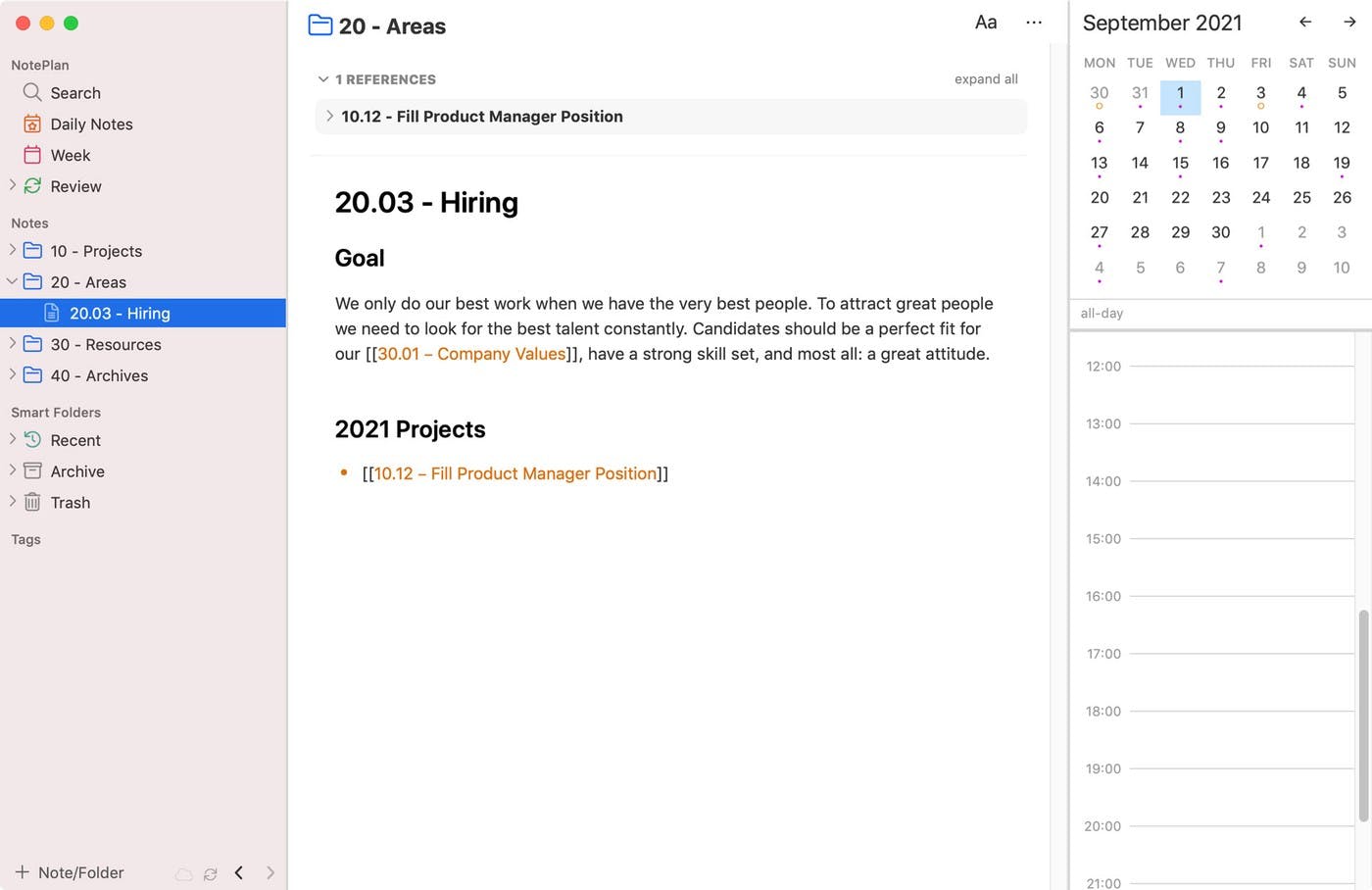 For starters, bi-directional linking makes it easy to connect tasks, projects, and areas. For example, inside an area, linking to [[a project]] will make it show up inside both the area and the project. You have a lot of freedom on how to approach this, too. You can simply list all projects or add an area link at the top. Whatever works for you: NotePlan doesn’t force you into a way of working.