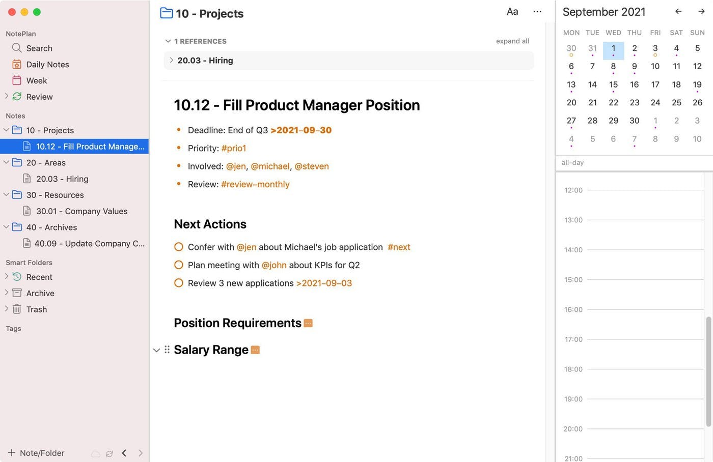 In this example, the “Fill Product Manager Position” project is a note inside the Projects category. The Project has some meta information at the top, such as a deadline, priority, stakeholders, and a review interval. The next actions are listed, as well as some information that is collapsed.