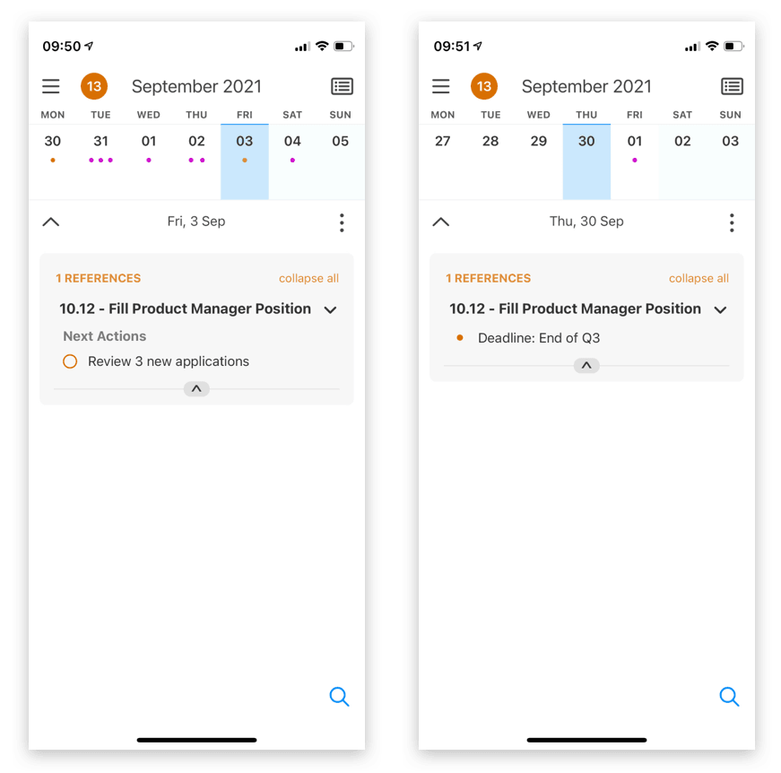 Here we added a date of September 3rd to review the “Fill Product Manager Position” so it comes up on that day. We’ve also added a deadline: September 30. If you navigate to September 30, the deadline is displayed.