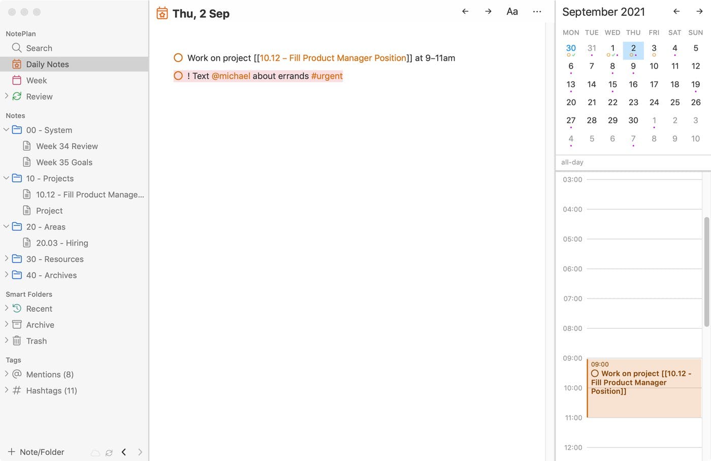Having your task management and calendar integrated inside NotePlan makes it easy to connect the dots between big-picture planning in Areas and projects and next actions, too. You can plan out all project steps entirely inside a single project. Add tags for priorities, mention people, link to reference material: it’s all possible. Next, immediately assign a date to your actions (start date/deadline/review date), and the actions will show up on the day you specified, right on your calendar.