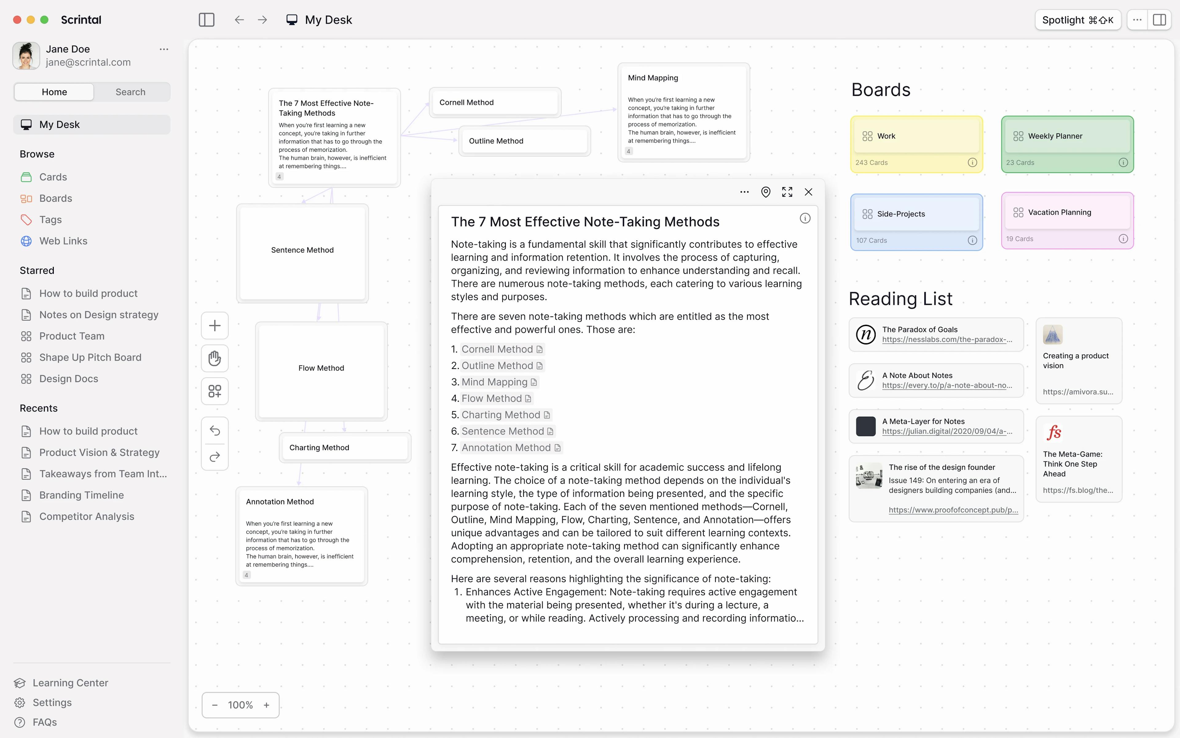 - Visual Organization: Scrintal's core strength lies in its visual board-like interface. Notes and ideas become cards that you can arrange freely.