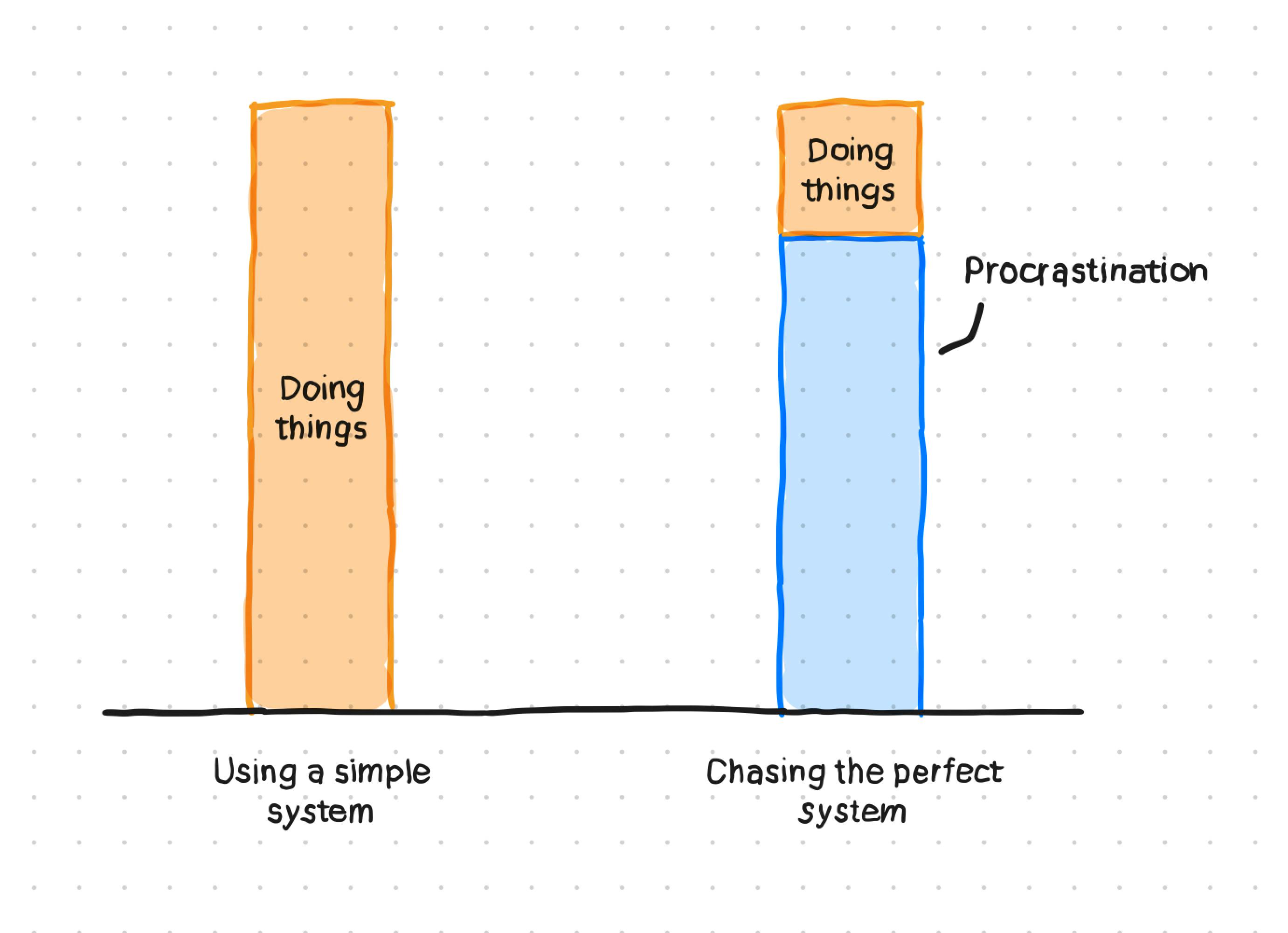 A squeaky clean productivity system feels good, but it’s not the end goal. The goal is to make meaningful progress on things that matter. It’s okay to have a few loose ends, as long as you’re generally moving forward. Better to get things done imperfectly than to have a perfect system that never gets used.