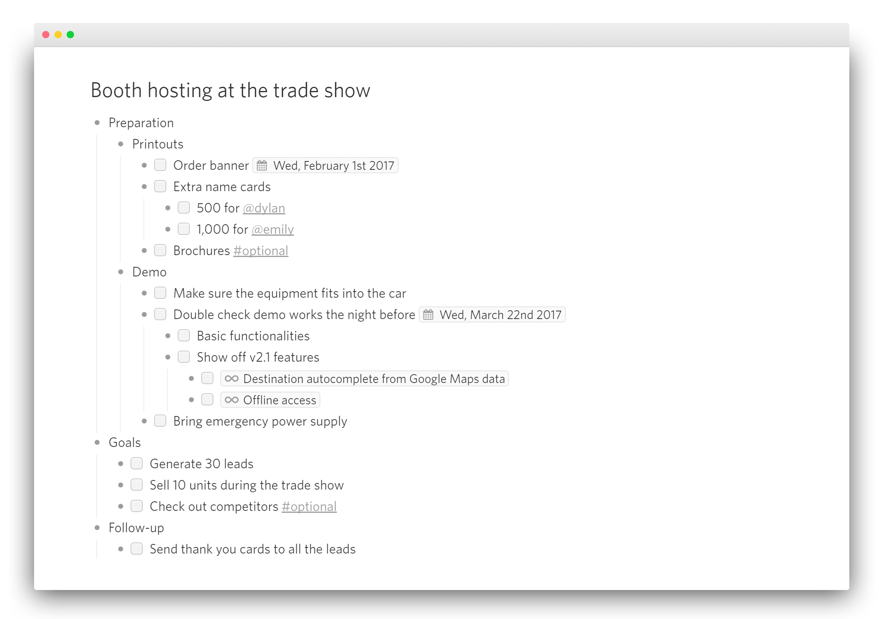 The shorthand for rapid logging you love in your Bullet Journal, is available in NotePlan as well. It uses Markdown, a user-friendly syntax that converts symbols into specific entries: