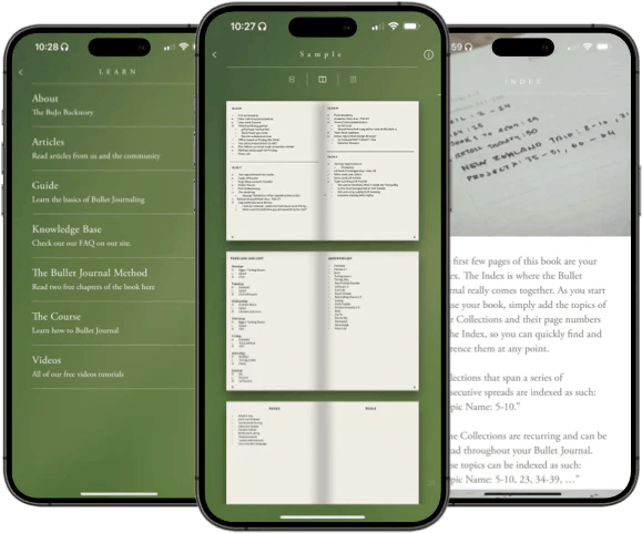 The Bullet Journal method was developed by Ryder Carroll to develop “a system flexible enough to handle whatever I threw at it, and fast enough that it wouldn’t get in the way.” The goal was to use a single physical system to keep the past, present, and future organized. A Bullet Journal uses pen and paper: everything lives inside a notebook. To get started, you manually structure your notebook into different sections: