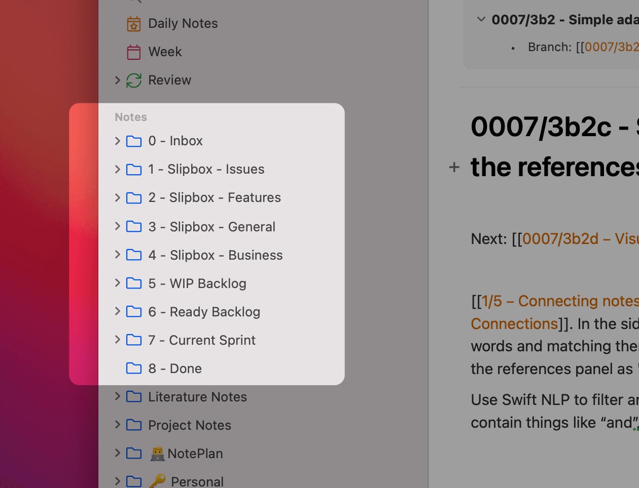 Today, I have 909 notes and I have used this system for a few months. I created several slip-box folders: features, bugs, general and business. Notes can be still interconnected between the folders, it’s just easier to find related end-points this way. In general you shouldn’t restrict yourself to specific topics though.