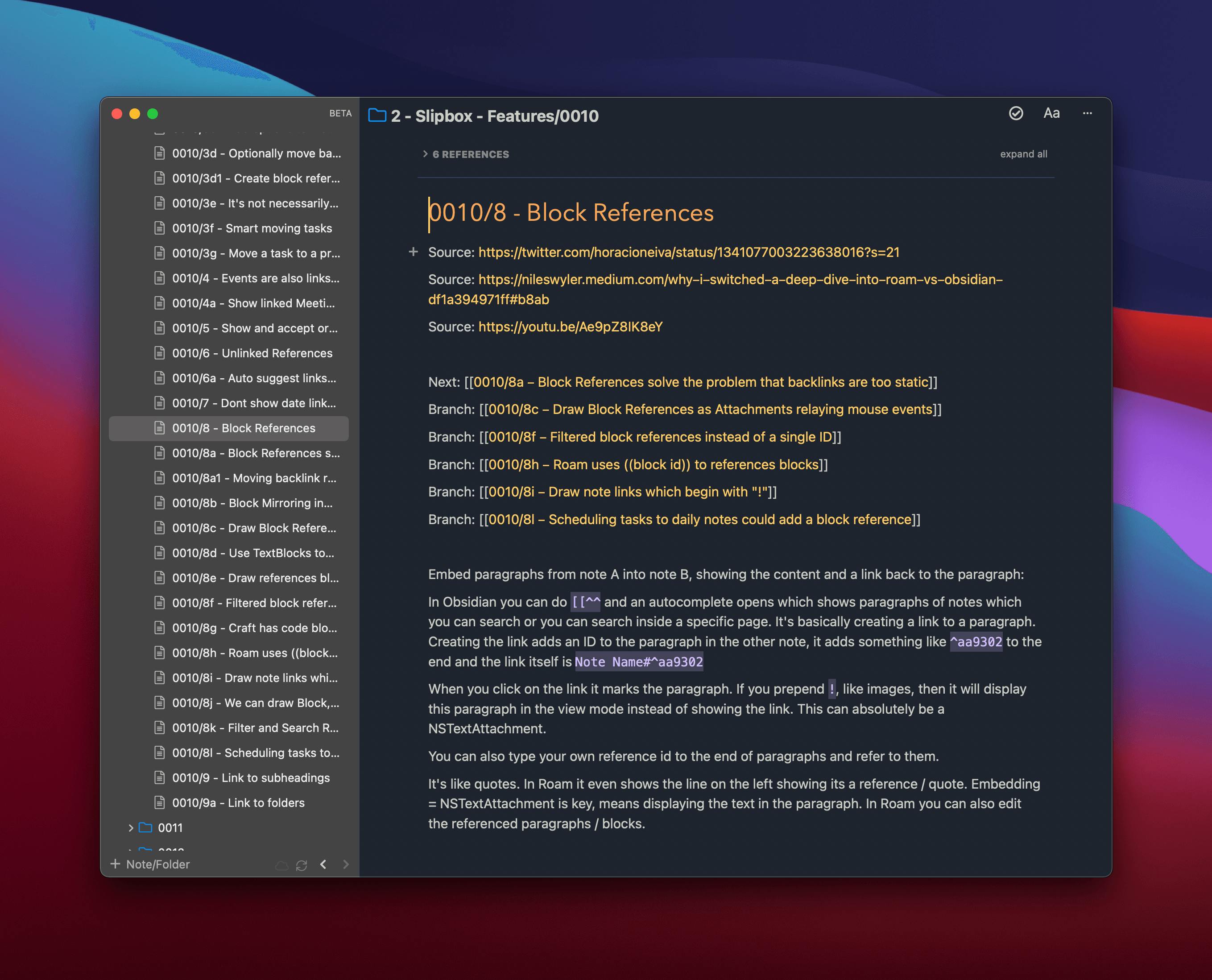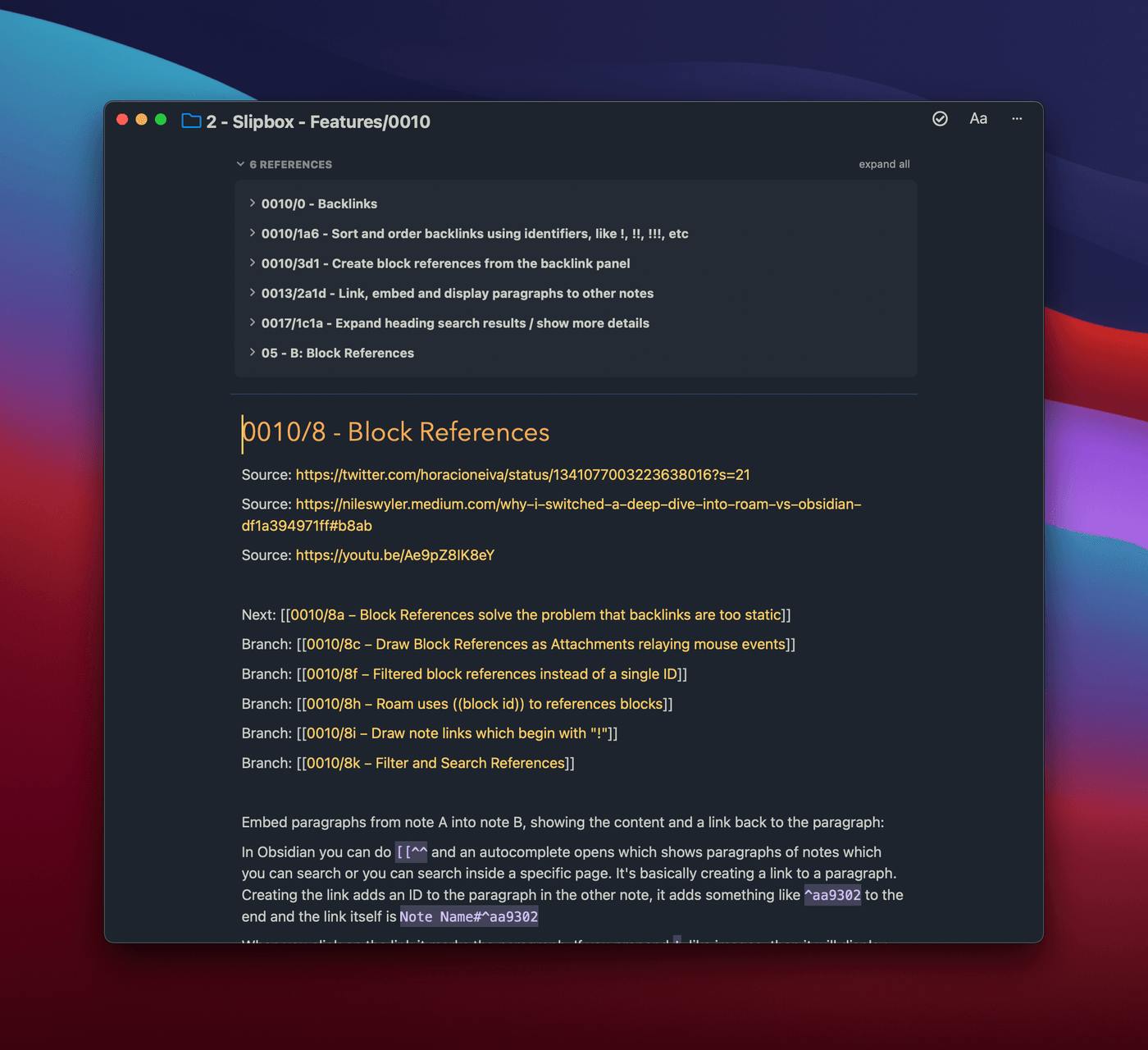 I have one note which is an entry point to the topic, which I originally named “Block References”, which itself is linked in “Backlinks”: