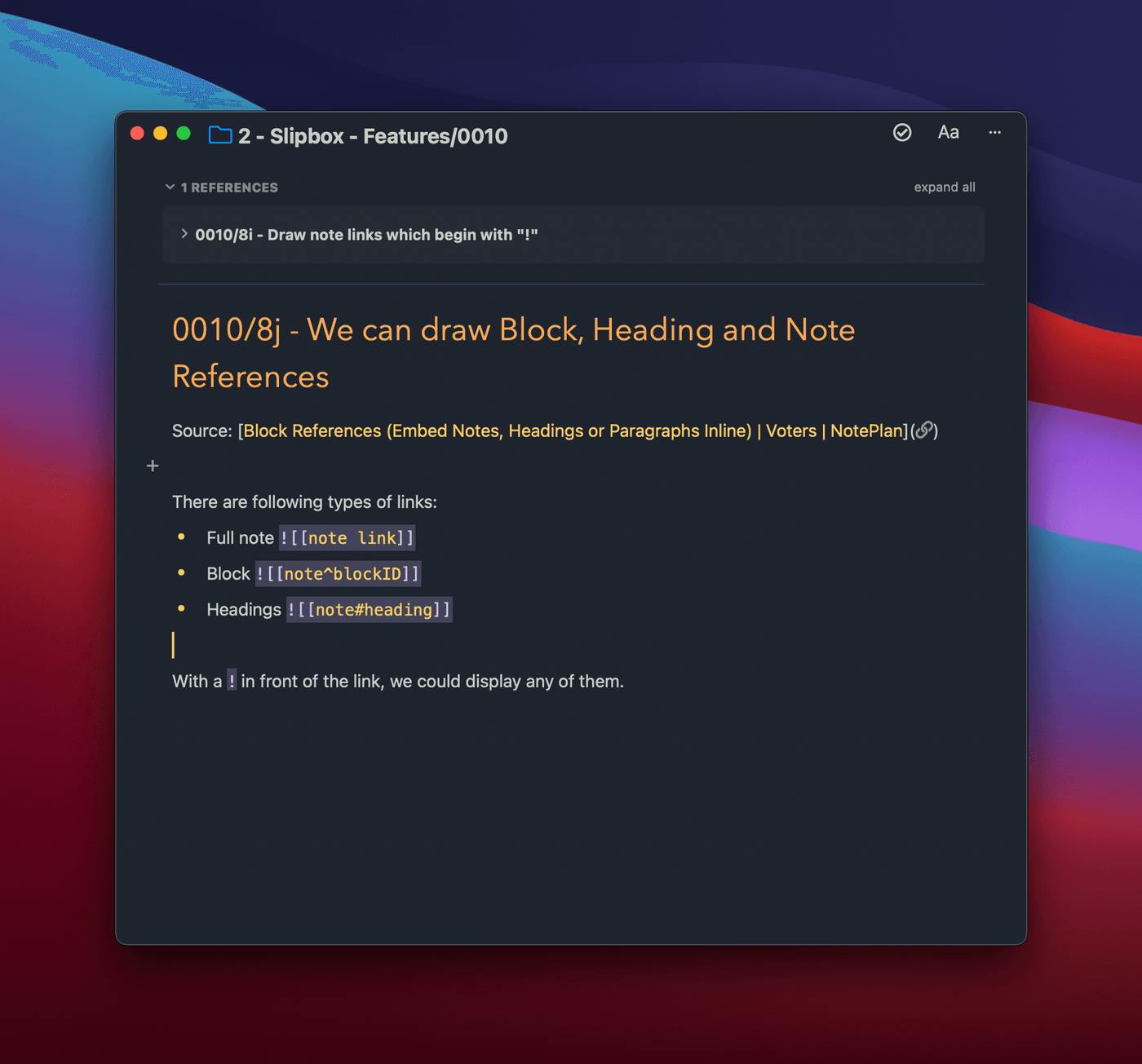 Before I show you an example of a useful ZK note, let me explain the context. One advanced linking feature in today’s note-taking space is to link to a block (effectively a paragraph) of text. However, creating and displaying just the link, so you can jump to the linked position is just one part of it. This kind of linking becomes even more useful if the content represented by the link can be displayed inside another note. Then you can embed paragraphs of other notes inline. This is not only hard to explain, but it’s also hard to wrap my head around a possible solution which fits elegantly into NotePlan. It has many moving parts in the code. This is a feature I would call “non-trivial”. It doesn’t help me to add it to a list of feature ideas — I would never be able to start working on it this way.