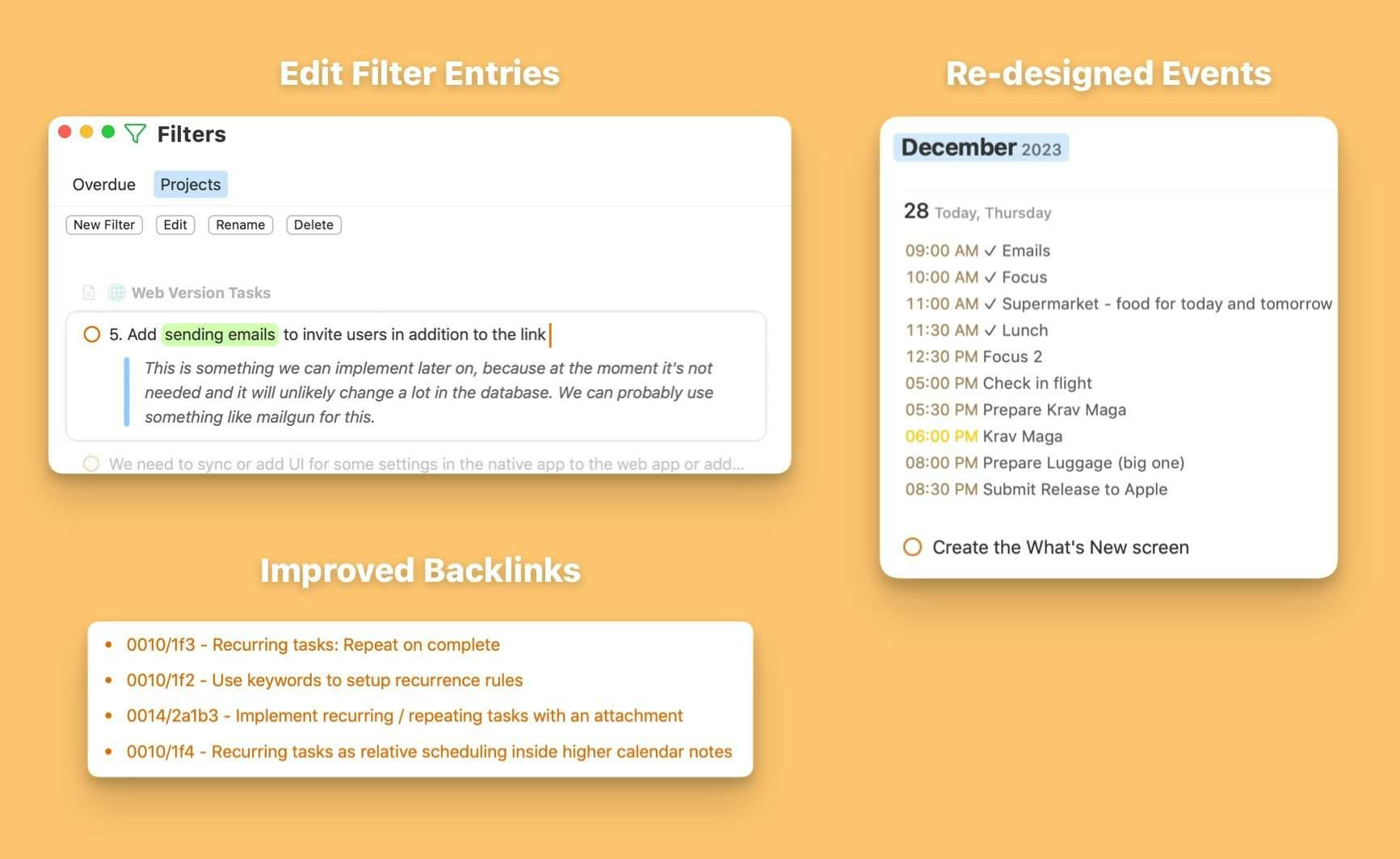 Plan smarter and keep your eye on what's next. You can now switch between your daily timeline and filters in the sidebar, on macOS, iPadOS and iOS.