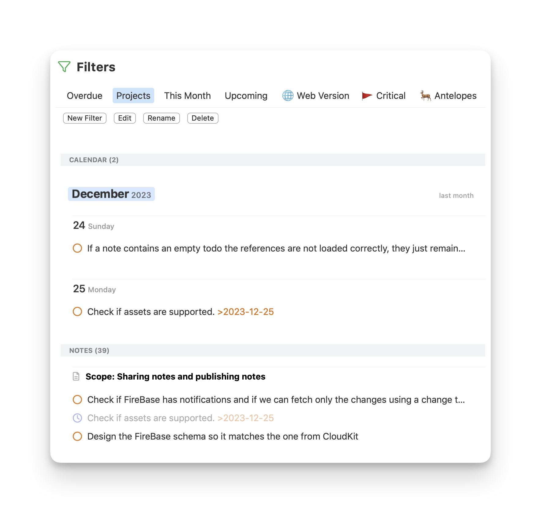 Besides this the filter logic has been improved, so you can see monthly and weekly tasks easier and correctly sorted and when you are filtering for a project folder (to see all the open tasks in your project notes), you can turn on "Calendar" to see all the scheduled tasks above.