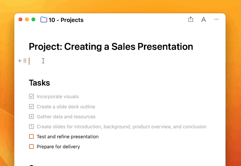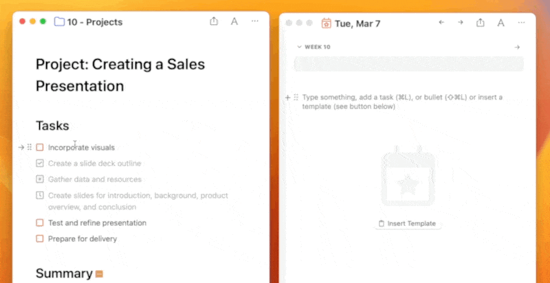With synced lines, you can keep a line synchronized across notes. It’s a perfect way to ensure that a task attached to a project note is synced when you complete it in your daily note, for example. Simply click the handlebars next to an item and choose “Copy Synced Line”. Or hold down Cmd as you drag a task from your reference note or periodic note (e.g. your Weekly Note) to create a synced line. Just look for the blue NotePlan asterisk to spot synced lines: *