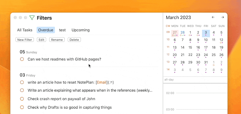 The latest updates to NotePlan already expanded drag and drop. Now, in NotePlan 3.8.1 you can drag things from practically anywhere onto the calendar or daily timeline. That includes Search, Filters, and References (macOS only for now).