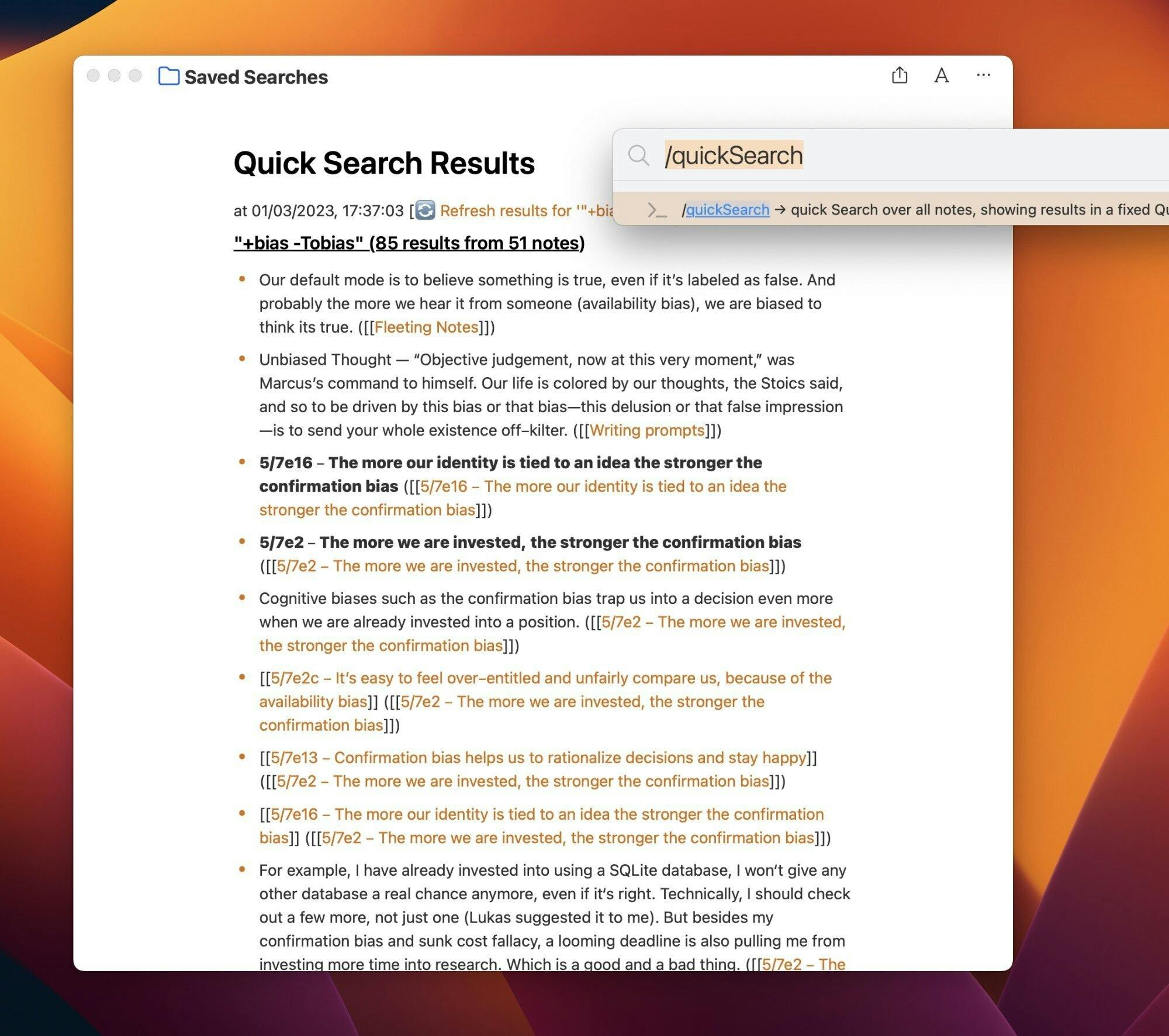 With SearchExtensions, you have greater control over your search terms. For instance, let's say you want to find all notes that mention the word "bias" (in the context of psychological biases), but you want to exclude any results containing the name "Tobias". Not a problem! Simply use the following search query: "+bias, -Tobias". And if you want to exclude an entire note that contains a certain term, just include "!exclude-me" in your search.