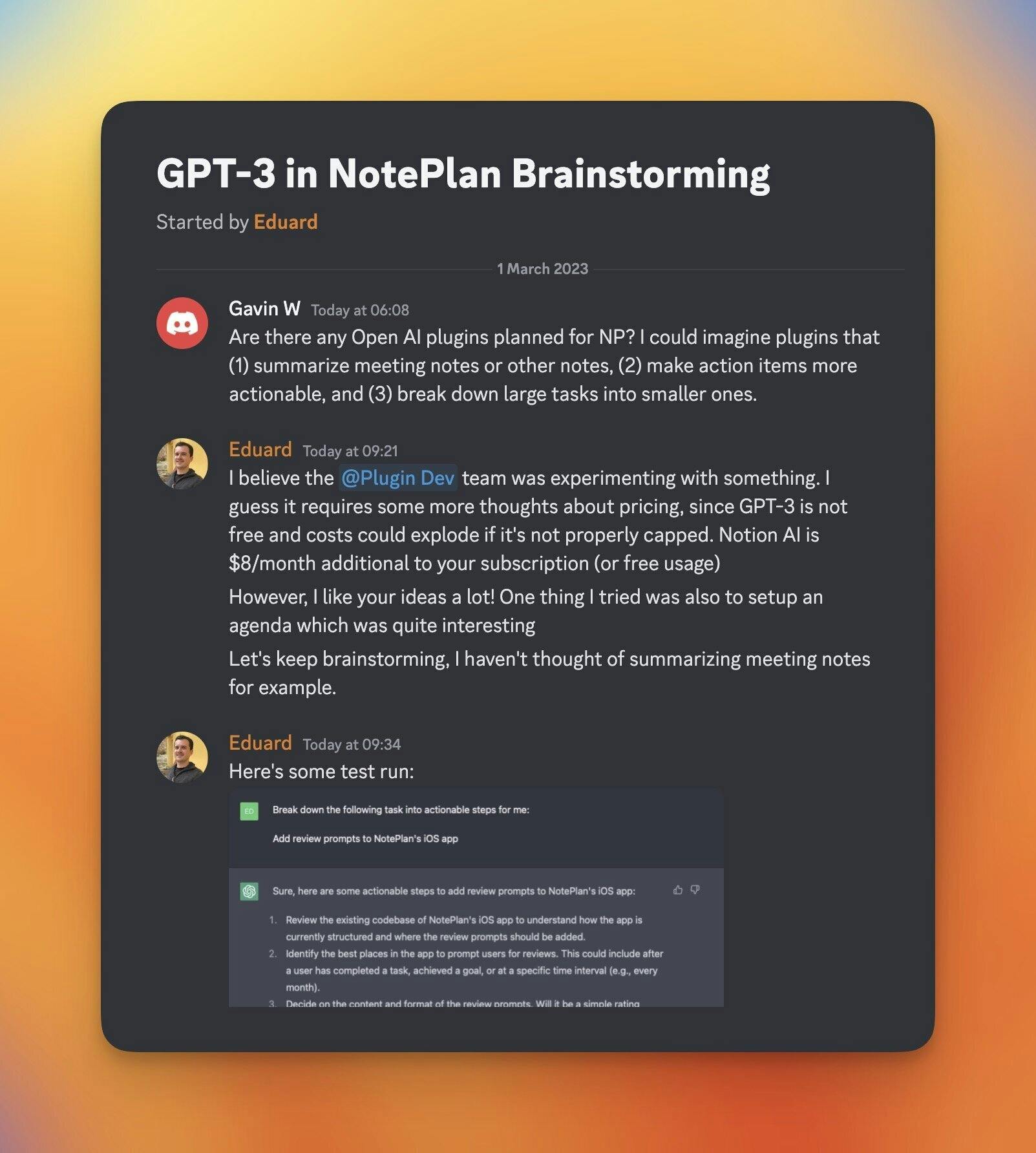 AI is a big topic these days. Many note-taking apps are integrating "GPT-3", the engine running AI and chatGPT to summarize texts, come up with content, etc. We haven't added this to NotePlan yet, because I'm still looking for a useful use case. Summarizing meeting notes could be one. Join the discussion on Discord and contribute your ideas.