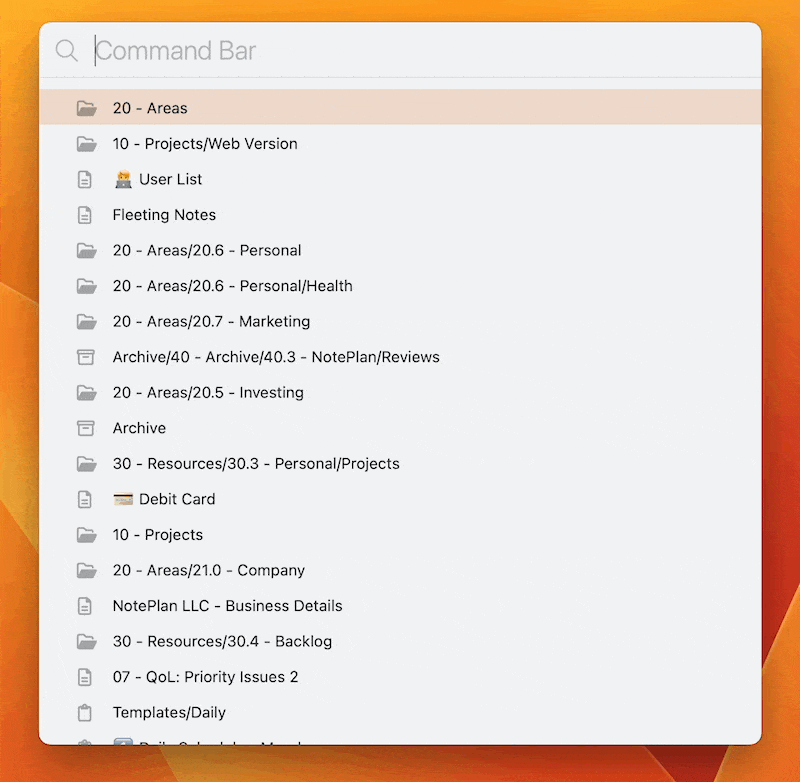 - Folders: You can now search for Folders with the Command Bar (Cmd+J) and link to folders just like you can link to notes: [[Folder Name]]