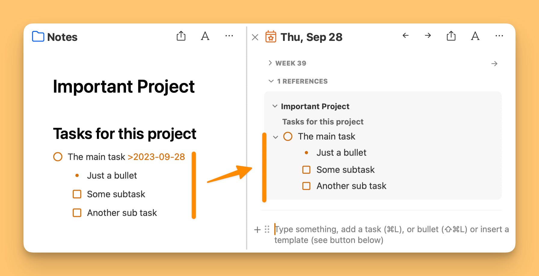 Next, you can drag an entire block of tasks with all subtasks simply by grabbing the top task. All tasks underneath are related to the first task, so it makes sense that you can drag and drop it as a single block. Bonus tip: this works inside references, too! So drag a block from your references right inside your daily note!