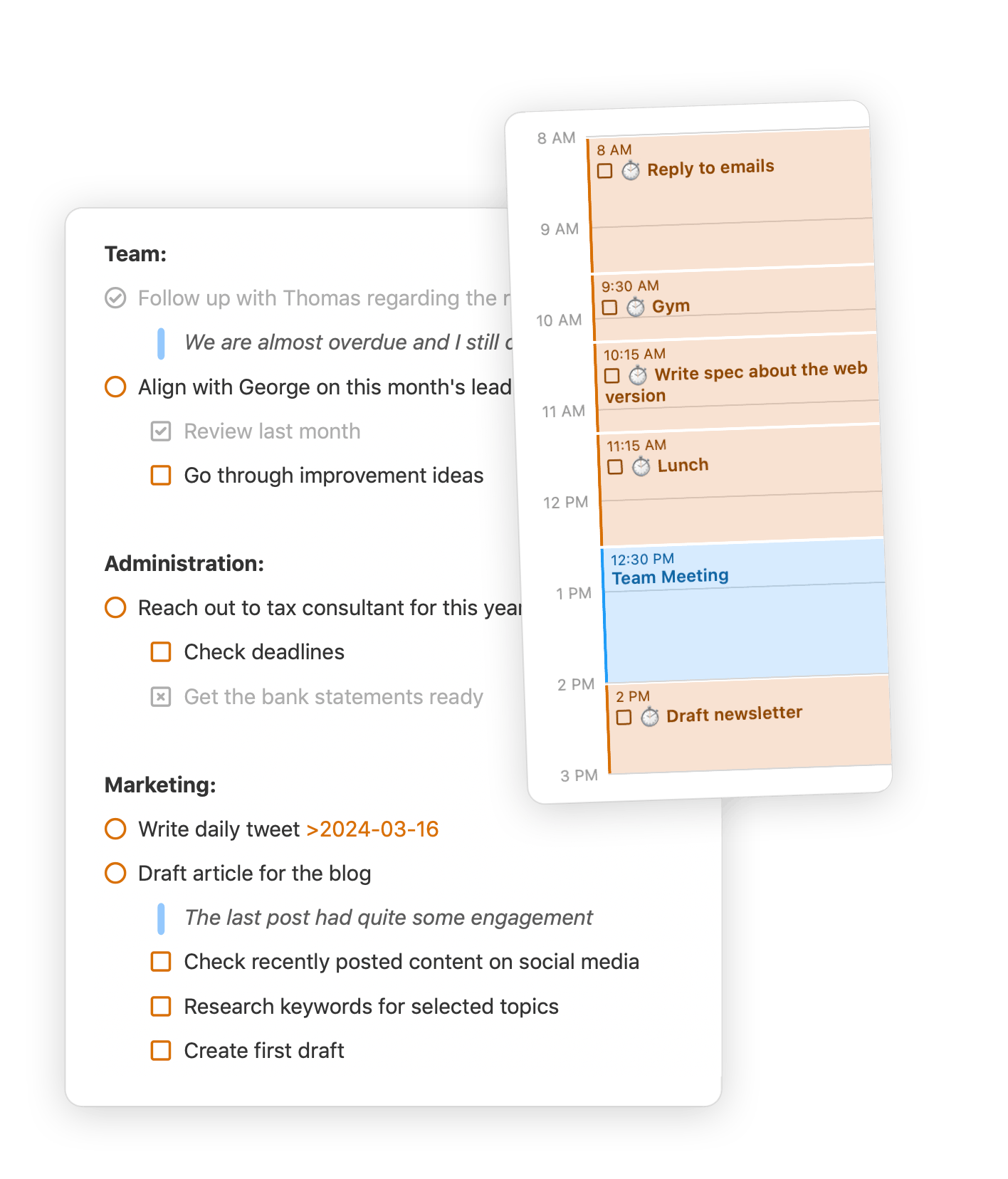 - Structure your day with NotePlan's time blocking capabilities. Assign time slots to important tasks for increased productivity.