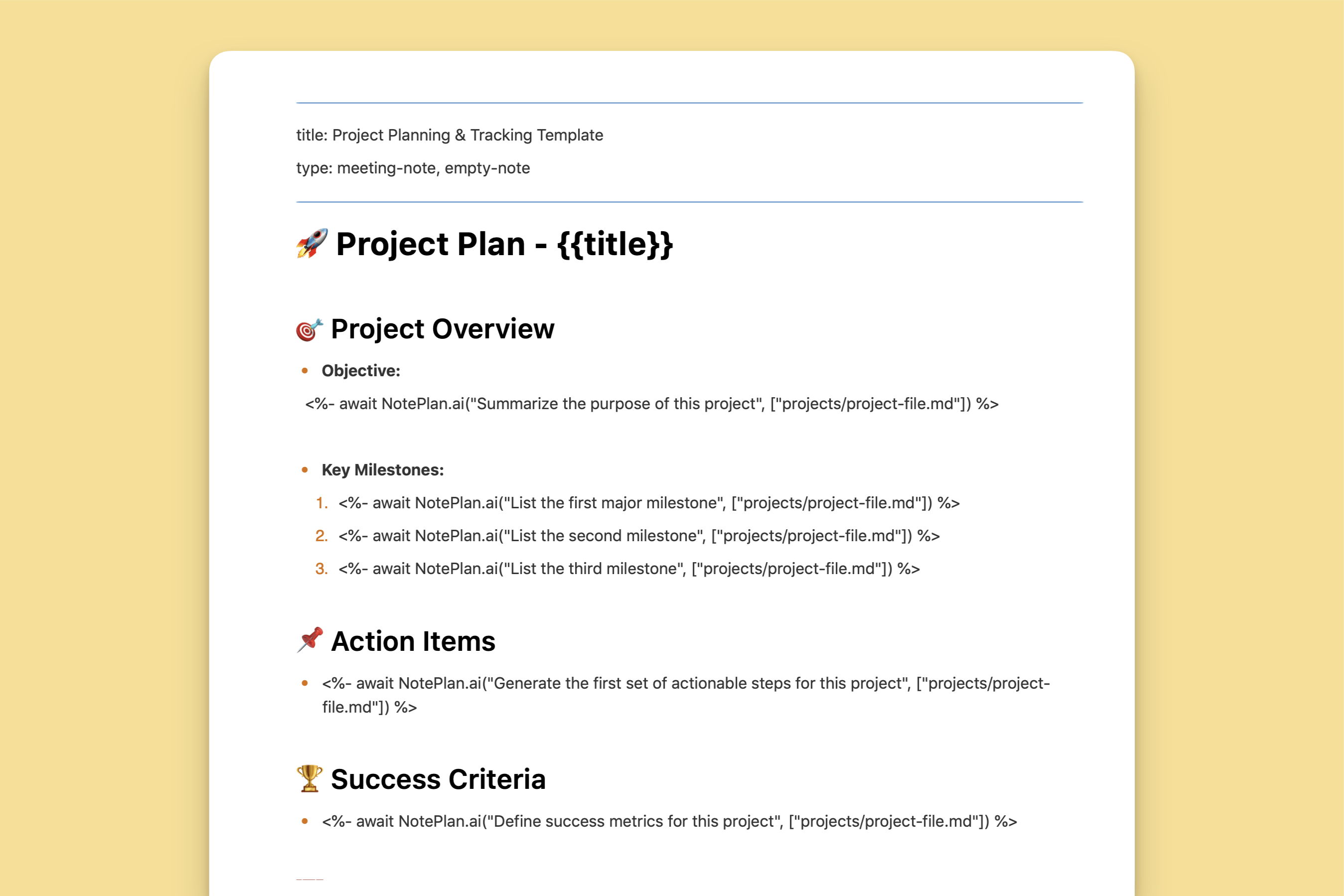 With the integration of NotePlan AI Prompts, this template automates the retrieval of key details from your project notes, allowing you to focus on execution rather than manually compiling information. AI dynamically pulls updates from your existing notes to summarize objectives, suggest milestones, and provide actionable next steps, making project management more efficient and data-driven.