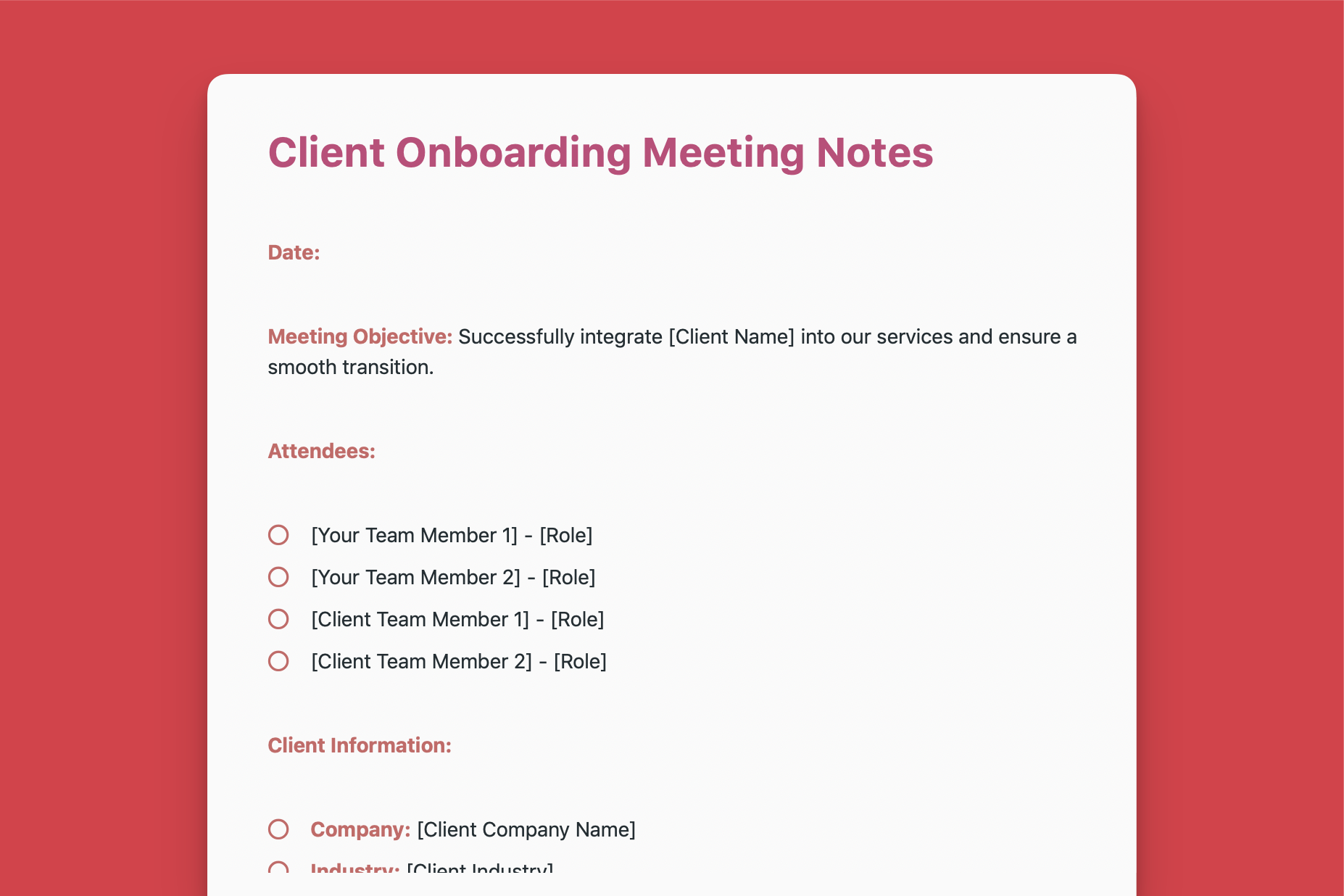 - Meeting Objective: Clearly state the primary goal of the meeting, which is typically to successfully integrate the new client into your services and establish a solid foundation for a long-lasting partnership.