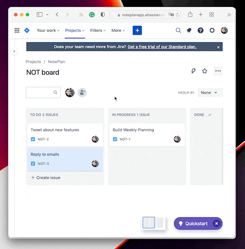 - Your organization URL, such as "https://noteplanapp.atlassian.net"