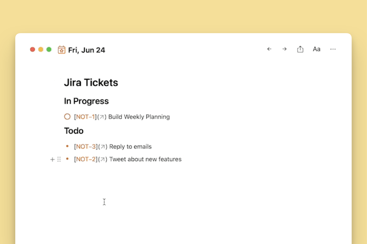This template will pull all tickets assigned to you with the status "To Do" and "In Progress" into the current note.
